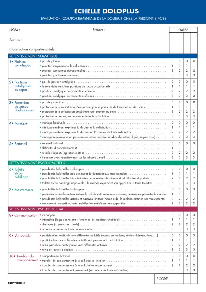 - L’échelle DOLOPLUS (lien pour impression ou téléchargement) évalue une douleur chronique chez la personne âgée non communicante.