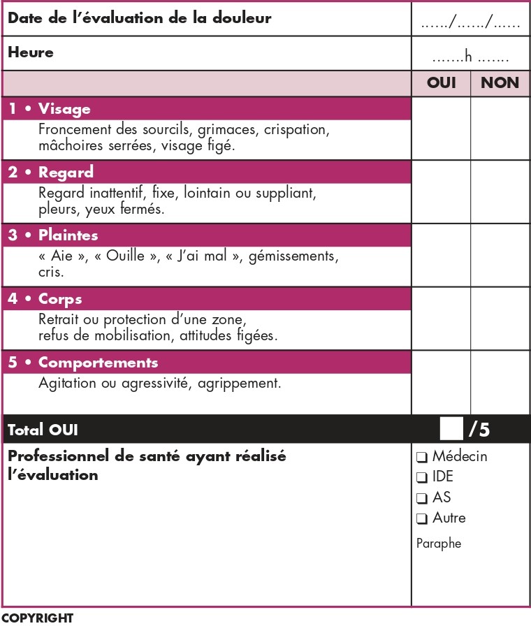 - Un score supérieur ou égal à 2 signe la présence d’une douleur et la nécessité d’une prise en charge antalgique.